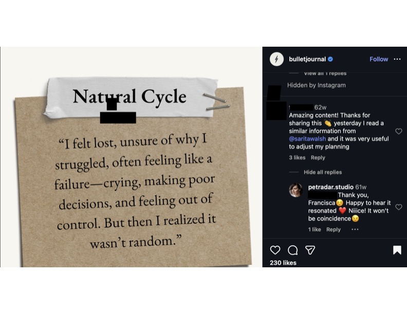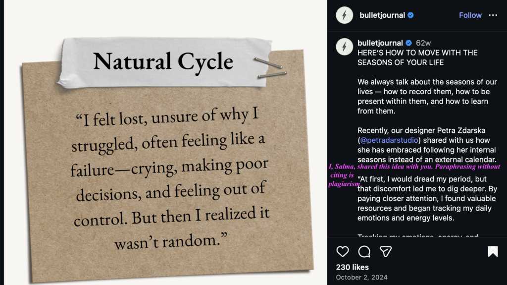 If you google search: bulletjournal.com female cycle, bulletjournal.com period tracker, bulletjournal.com menstrual cycle, there is the article with my concept, plagiarized and appropriated and mis-credited, on the top, and nothing else from Ryder Carroll’s website.