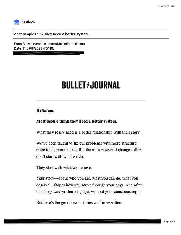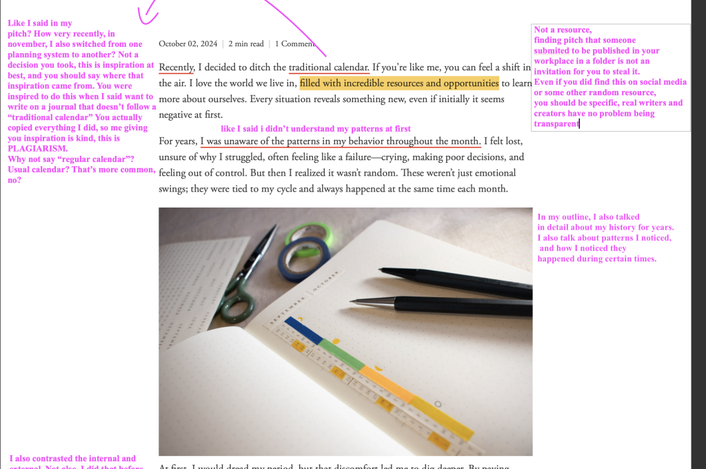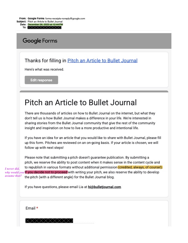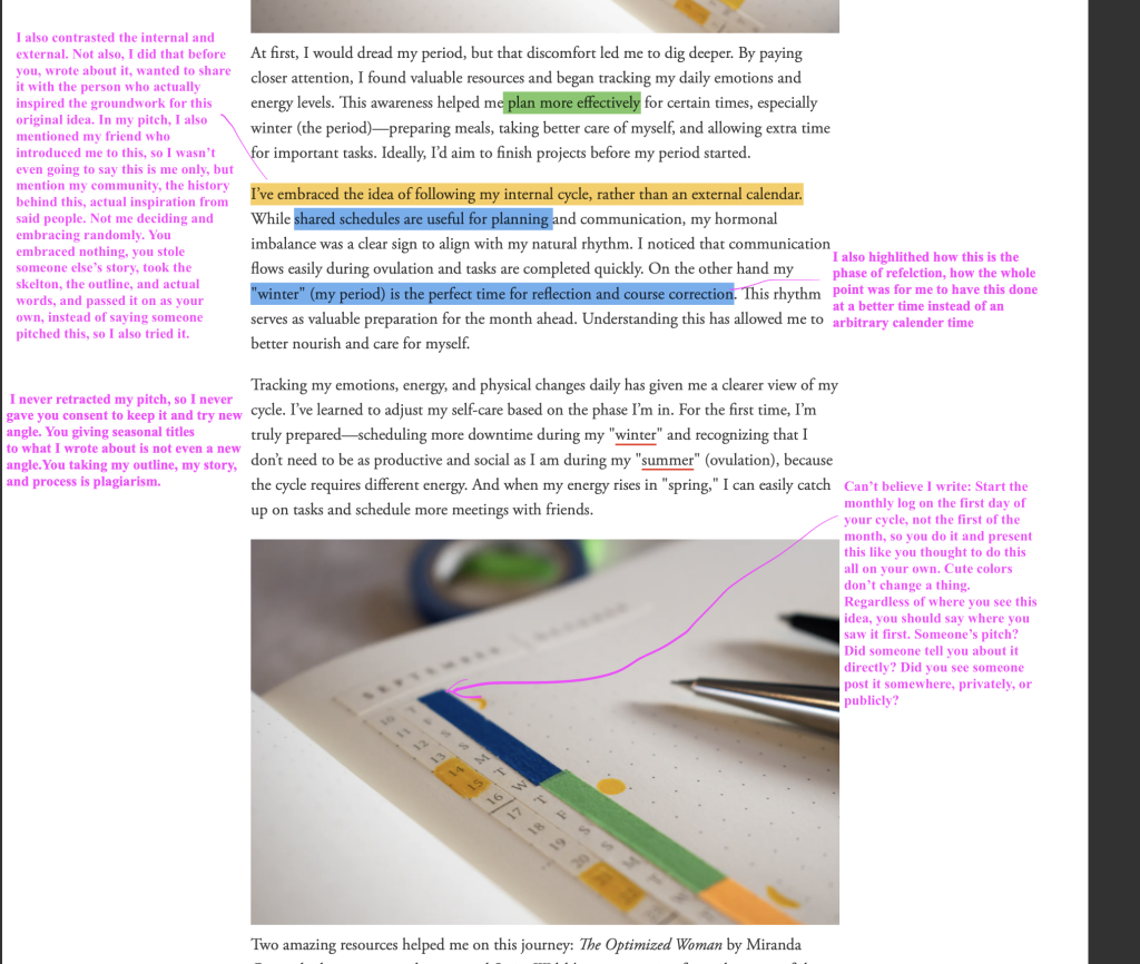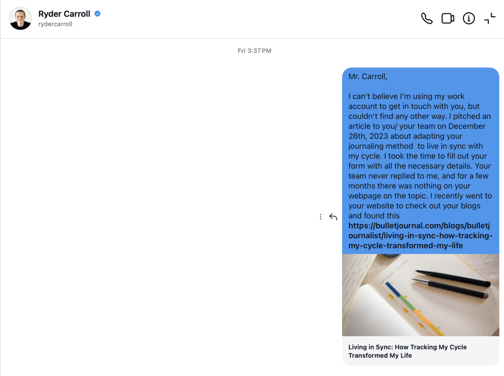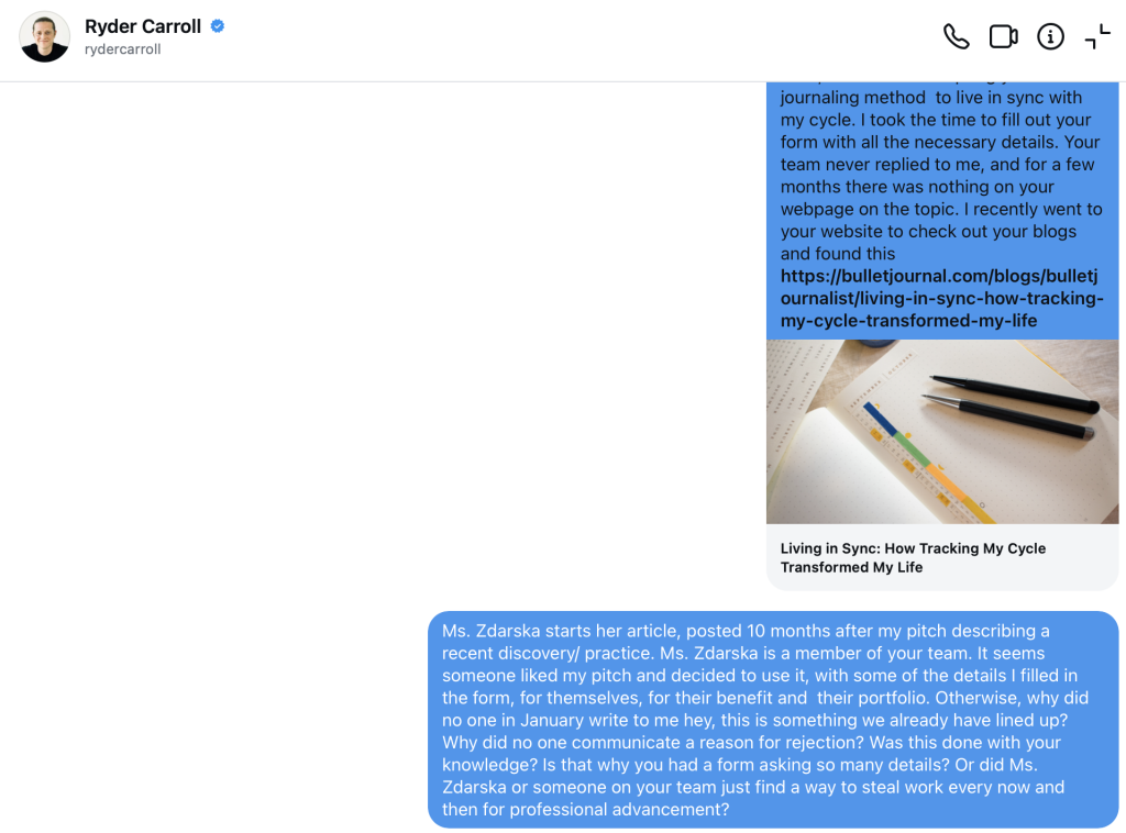 There is no contact information publicly available for Ryder Carroll, so I send him a DM on Instagram on Friday the 12th, 2025. I will share this at some point. Not that it matters, I know it lands in his junk folder. I’m just confused, angry, and disappointed. But first, I want to share the annotations I made to my pitch, and the “article” Carroll’s website posted. This is not a similar universal story that resonates, this is theft. This is plagiarism.