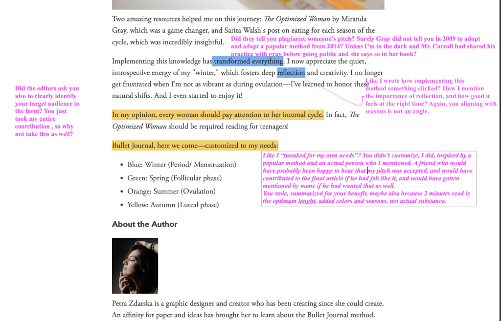 My story of course gets some bullet journal publicity, just with the wrong credits and meh mis-credited copy on the blog site like we see. Also the captions take from my pitch from 2023. Before you say there was no extensive copy and pasting, not of sentences as I phrased them at least, remember this: