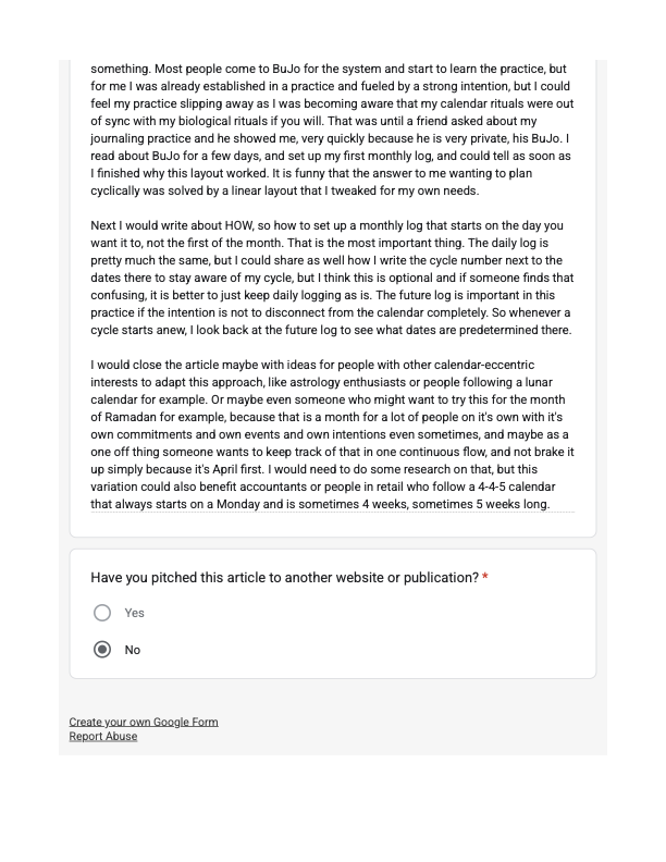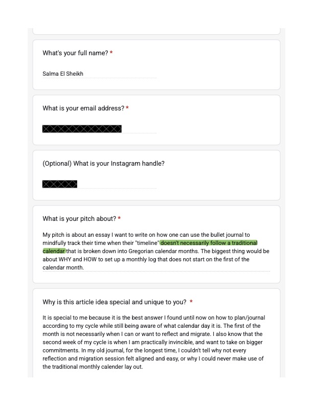 At that time, I started following Ryder Carroll’s work, and in December 2023, I was so happy to see that, on his website, he has a channel open for people to pitch their ideas and contribute to his blog, credited ALWAYS of course! I couldn’t find much more inspiration on bullet journaling and cycle tracking simultaneously, and so I thought this is definitely a chance for me to bring up this topic, and be a part of this discussion. So, I sent in this pitch on December 26th, 2023.
