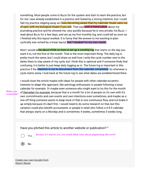 I know women have been tracking their cycles for eons, and humanity in general has been looking at the sky for millennia to orient itself in time, duh! My story that I pitch is original, my angle that they don’t even change is original, and my process is original.