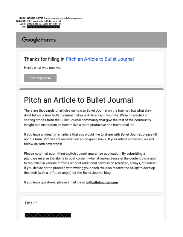 My personal email I check in January (a newsletter I got in my other inbox tells us the team is on break the last week of December 2023, and I also probably heard this in the BuJoU forum) to see if my pitch was picked up. This is the email with very little traffic, because I intentionally avoid newsletters to not miss important communication. This is the email they ask for twice on the form.
